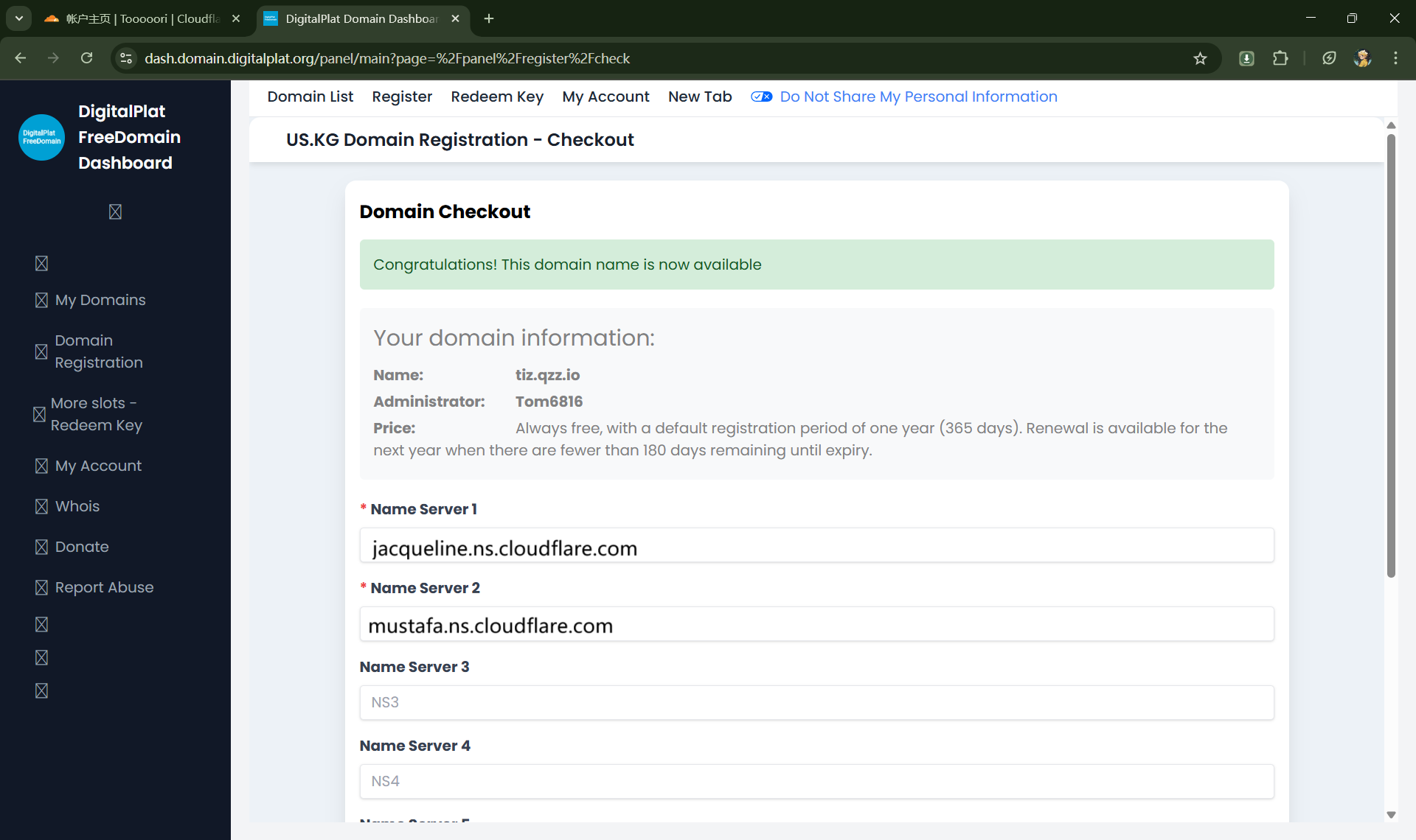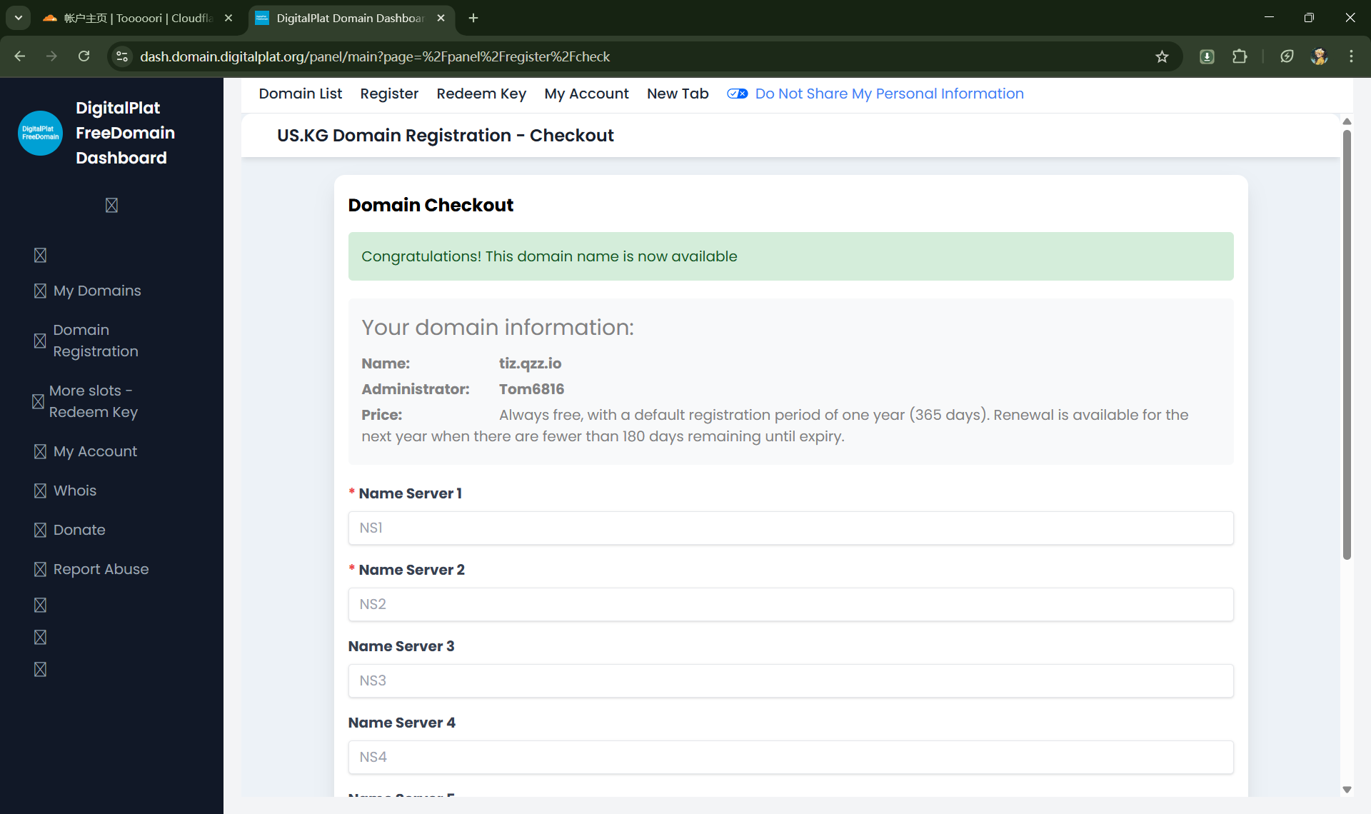 3.一个域名(可有可无,大陆用户一定要有),可以前去https://nic.us.kg/申请一个免费的us.kg二级域名,具体的下面会讲。