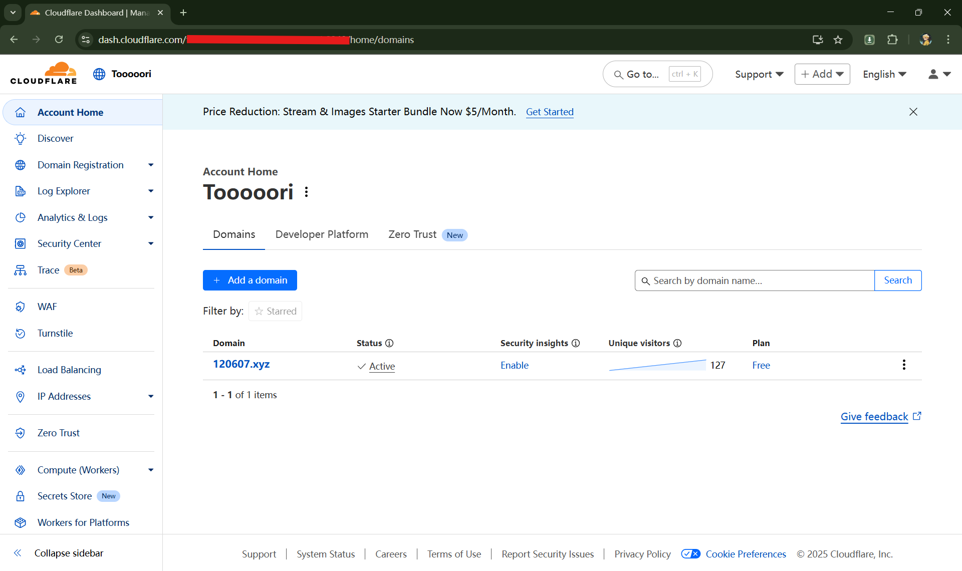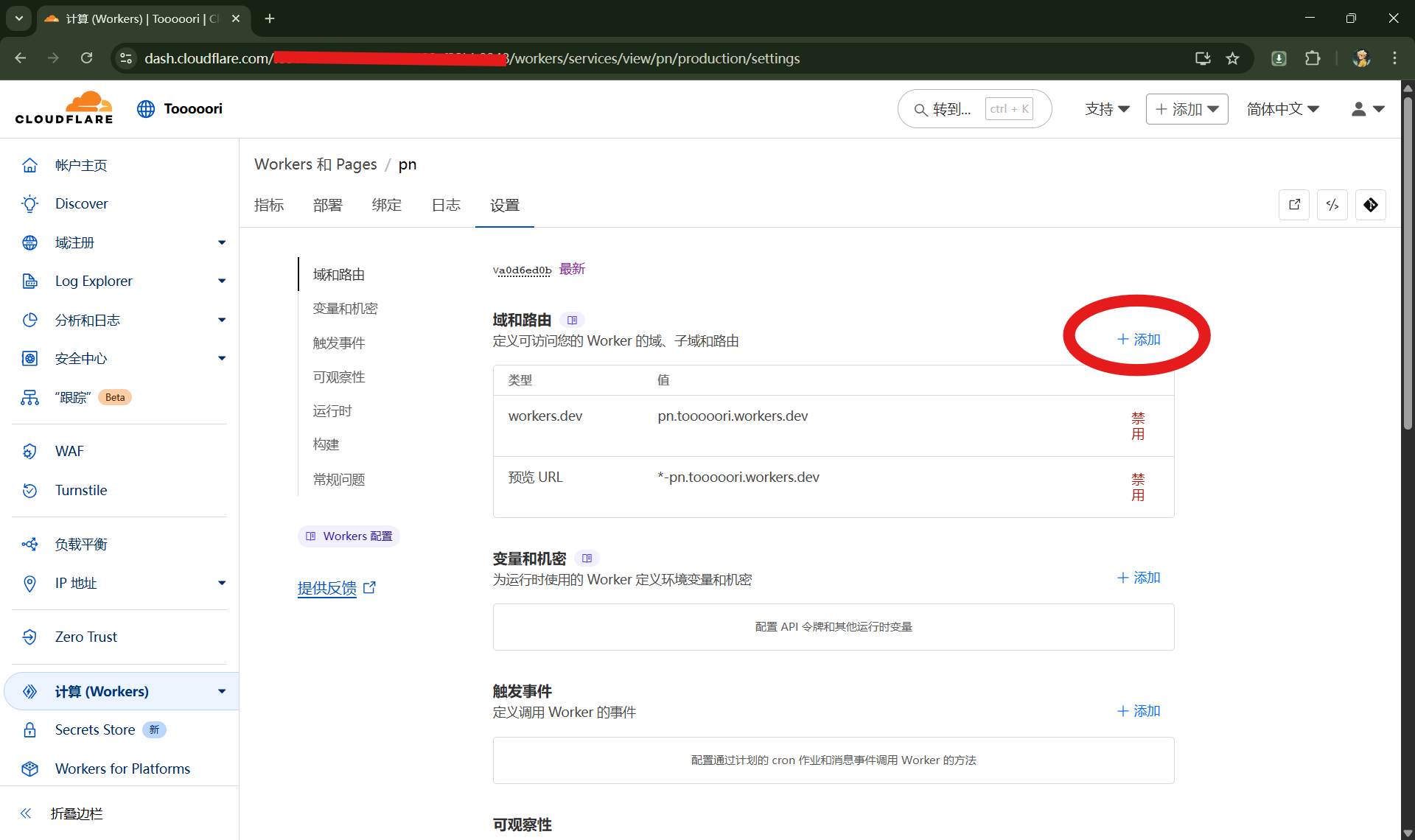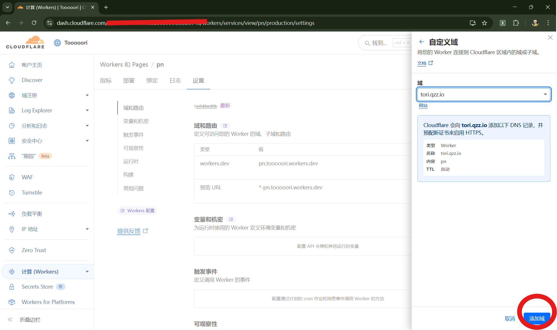 接下来需要将这个workers项目绑定自己的域名,不然cf给你的网址应该很快就会被墙掉(‾◡◝)
