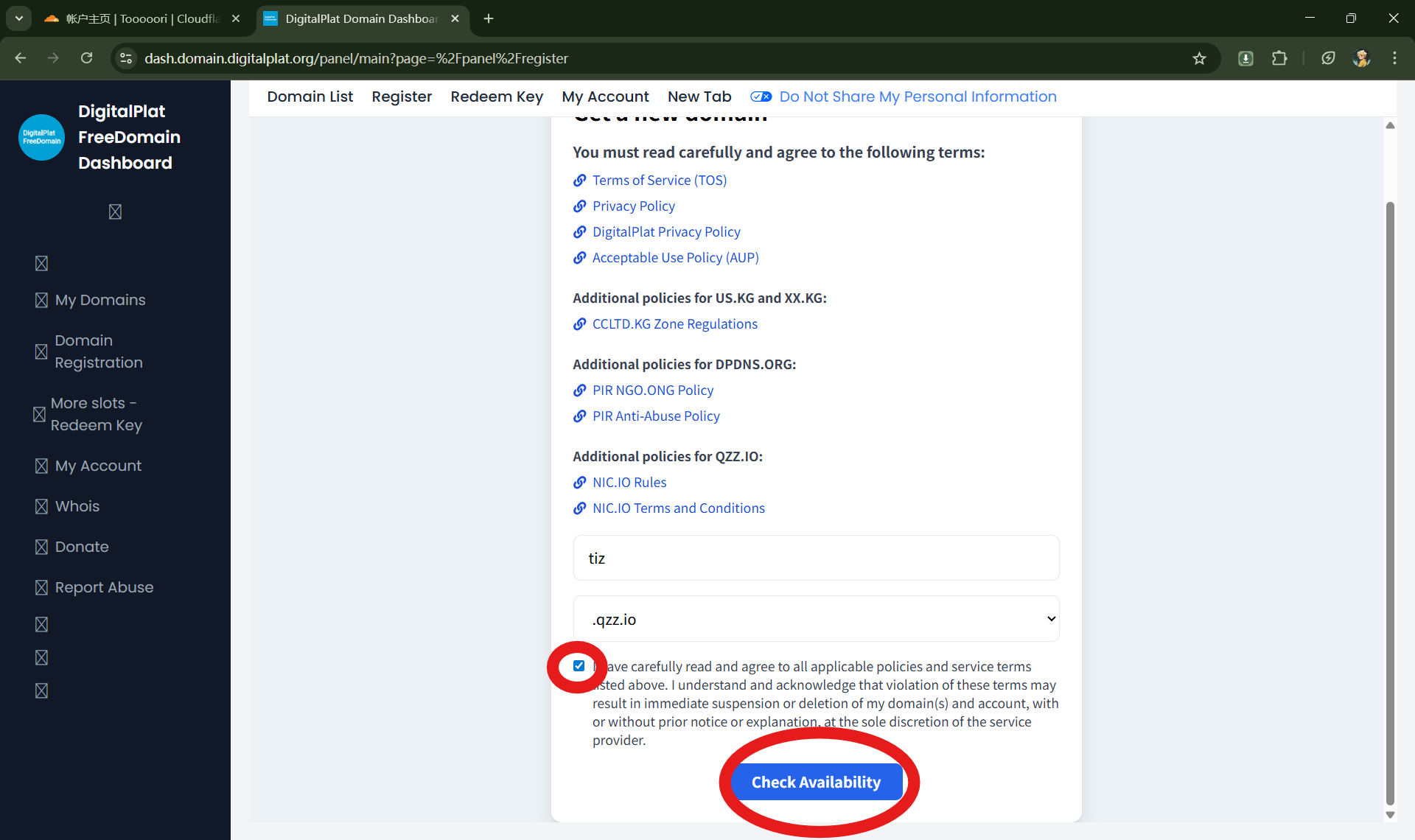 先点击Domain Registration,等待一下人机验证,然后在界面中的“Domain name"输入框输入tiz(.qzz.io前面的字母)