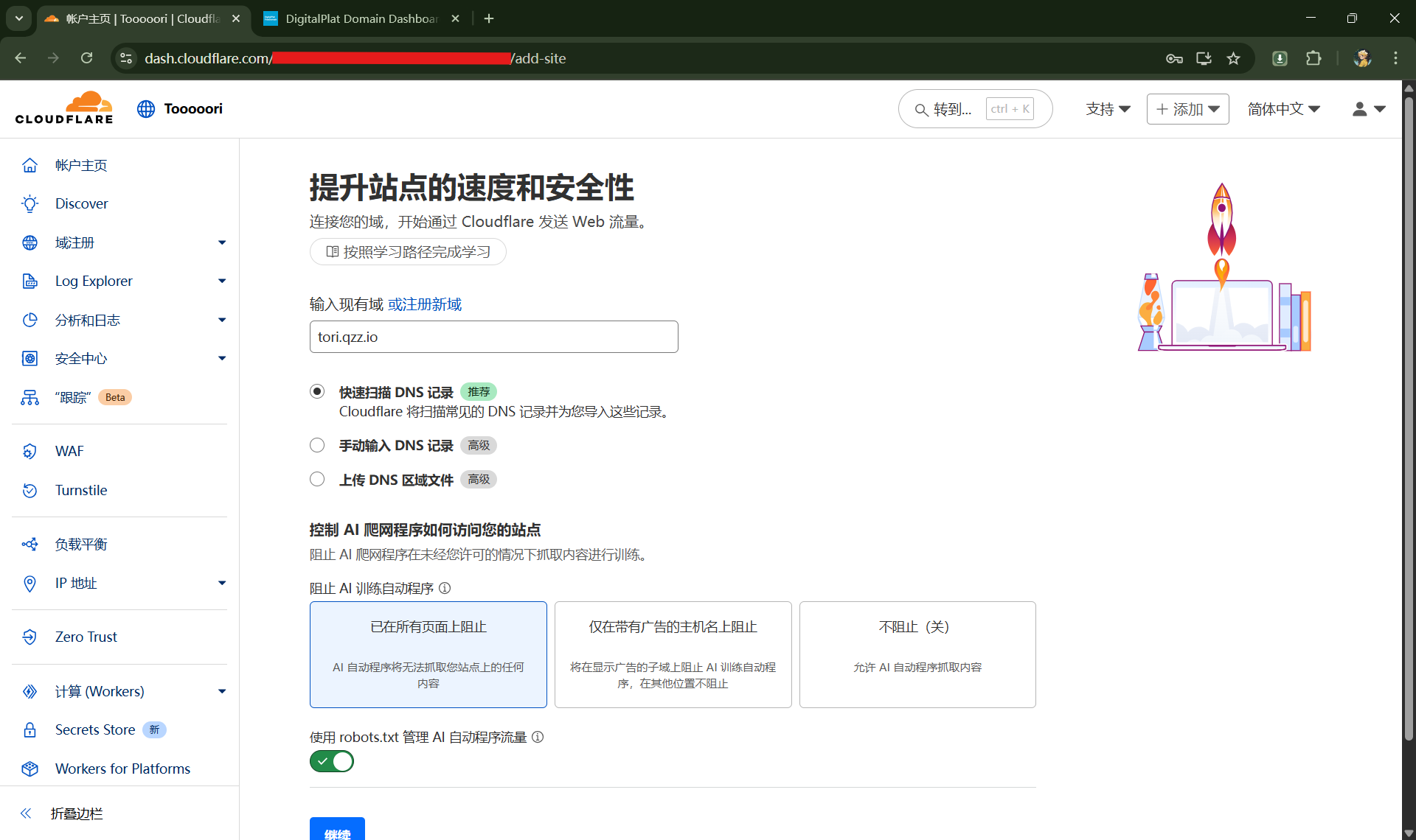 在“输入现有域”中输入你注册的域名,比如我的是tori.qzz.io: