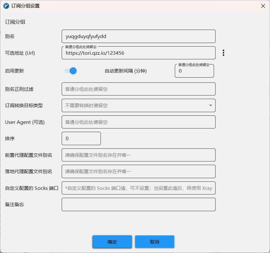 打开你的代理软件,这里以Windows端的v2rayN为例,点击左上角的加号,在弹出的界面中,别名随便填写一个,在可选地址(Url)中粘贴你刚刚复制的链接,像这样: