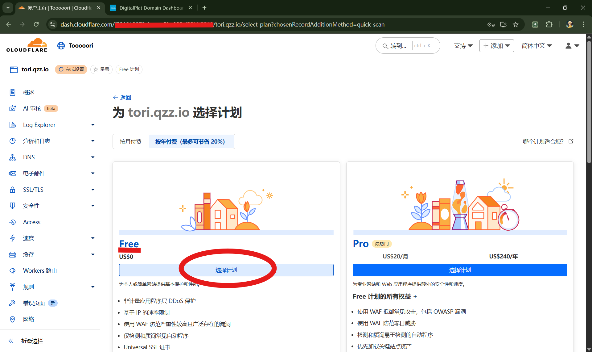 在下面的选项中选择qzz.io(目前选项中只有dpdns.org和qzz.io是免费的,其他的要付一美元甚至更多)