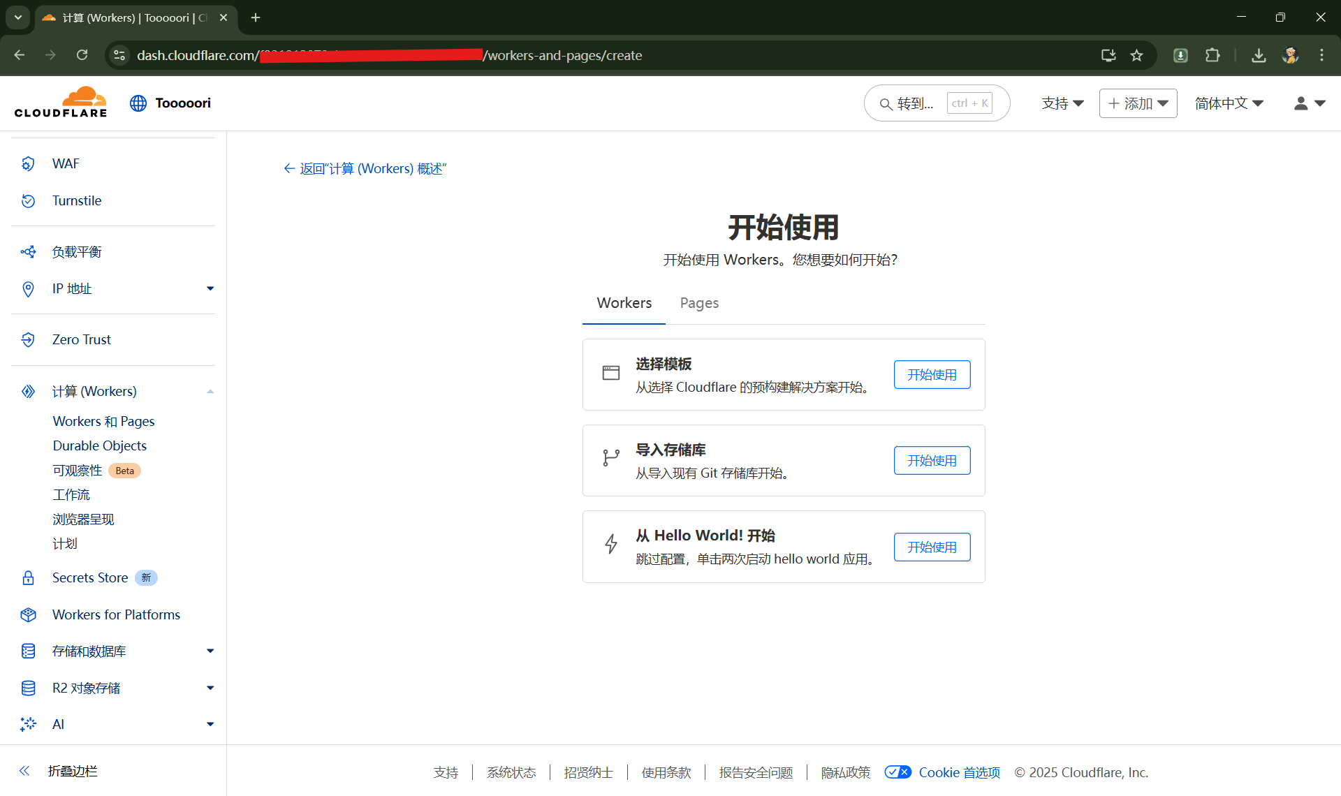 点击左上角的Cloudflare图标回到控制台首页,然后点击左边的计算(Workers)来到这个页面: